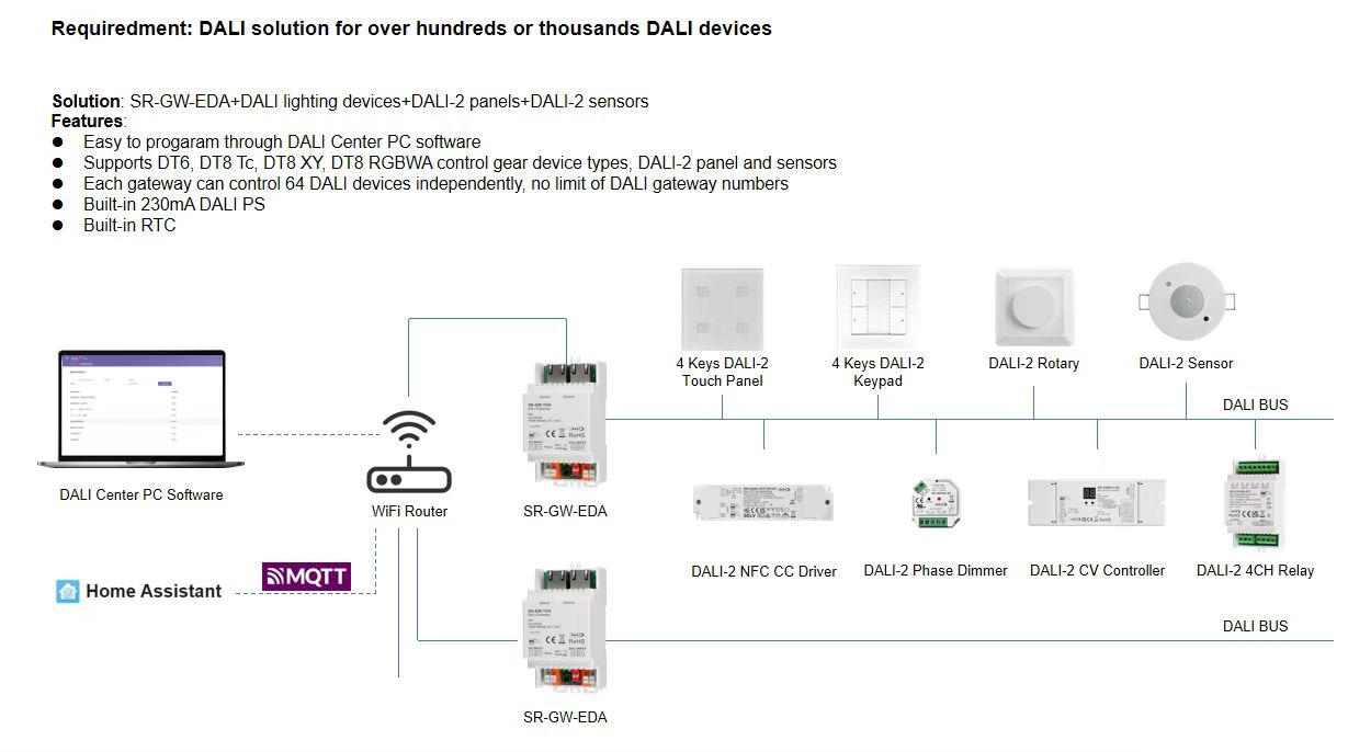 - Tất cả đèn DALI có thể dễ dàng thay thế, chỉ cần gắn lại địa chỉ hoặc quét lại hệ thống, không ảnh hưởng đến hệ thống dây dẫn.
